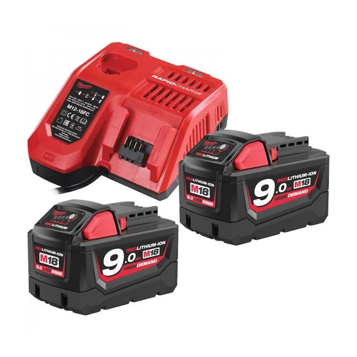 Комплект M18NRG-902 включва зарядно устройство M12-18 FC и 2бр. батерии M18 B9.