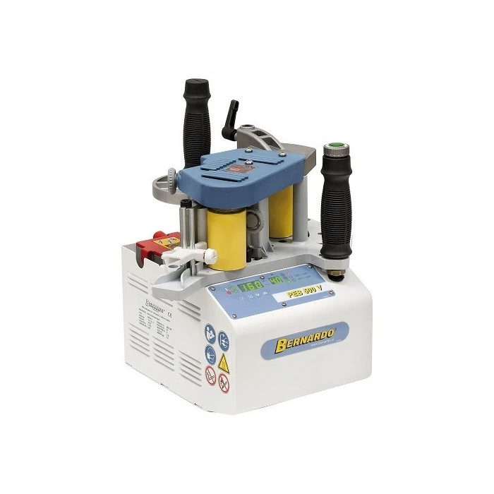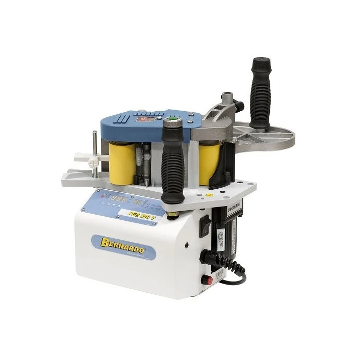 BERNARDO PEB 500 V е машина за лепене на кантове която също така е и професионална, проектирана за специалистите в производството на мебели. Скоростта на подаване на материала се регулира без степени между 2 и 6 m/min, като уредът работи добре със ABS, PVC, меламин, фурнир и другите популярни материали за покритие. Оптимални резултати ще постигнете както на равни повърхности, така и при наличие на извивки, но трябва да имате предвид необходимостта от минимален вътрешен радиус 25 mm. Дръжките са гумирани и са разположени за да осигурят комфорт на оператора.