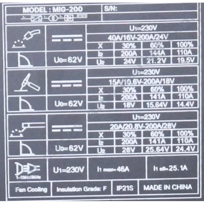 - ПВ при 200 А - 60%, напрежение на празен ход 18 - 24 V
