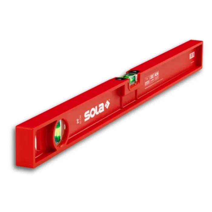 Нивелир от червена разпенена специална пласмаса правоъгълна форма. По-добро, по-бързо и по-точно отчитане чрез патентованите флакони SOLA FOCUS Акрилни флакони, устойчиви на разрушаване, с лупа (+ 20%) и гаранция за стягане от 30 години По-добра четливост при слаба светлина чрез оптимизирана светлинна подложка SOLA