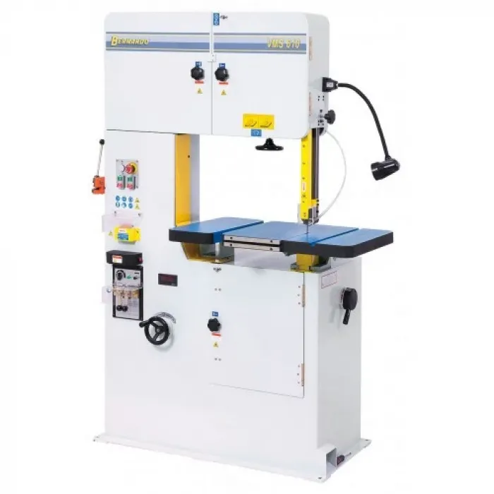 BERNARDO VMS 610 е вертикална лентоотрезна машина за професионална работа с масивна конструкция и висока прецизност при рязане на детайли с неправилни форми. Оборудвана е с безстепенно регулиране в два диапазона на скоростта за оптимален избор спрямо обработвания материал. Използва се за рязане на детайли с различни форми и от различни материали. Благодарение на допълнителната работна маса се създава удобство при работа с нея. Масата се накланя на 15° в 4 посоки за постигане на необходимата форма.