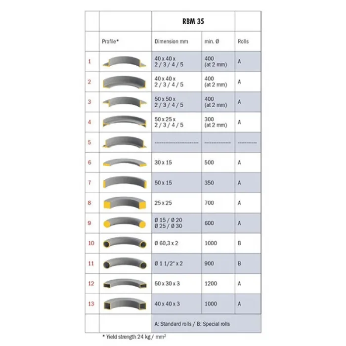BERNARDO RBM 35 е електро-механична машина идеална за огъване на профили и тръби, при която управлението става чрез педал. Вала е изработен от специална висококачествена стомана с диаметър 30 mm. Машината е с перфектно съотношение цена-производителност. В стандартното оборудване влизат стандартни ролки, странични водещи ролки, крачен педал с авариен стоп.
