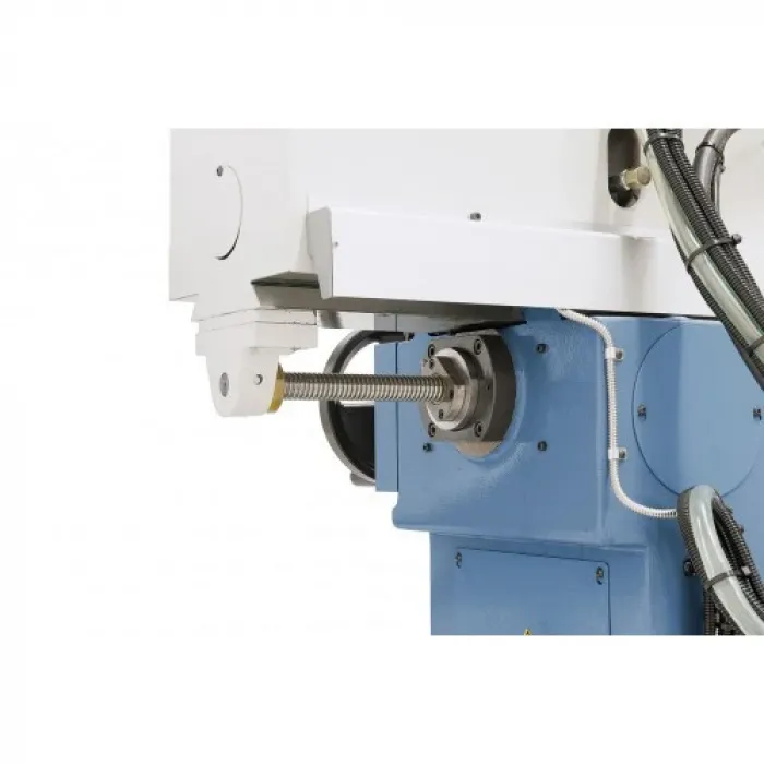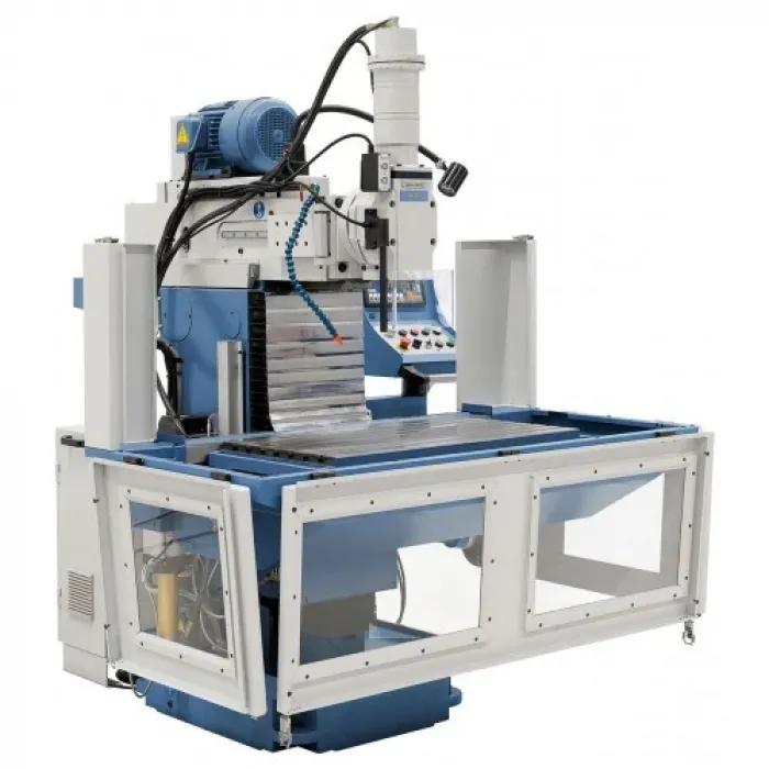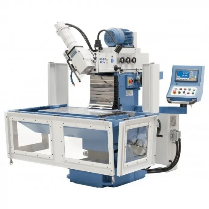 Окомплектовка триосно цифрово отчитане с LCD дисплей ES-12 H, LED работно осветление, охлаждащо устройство, подаване по X,Y и Z-оста, хоризонтално лагерно гнездо, работна клетка, сачмени винтове на всички оси, хидравлично захващане на инструмента, централно смазване, честотен инвертор, стоманен капак, дълъг фрезови дорник ISO 40 / 27 mm, преходни втулки ISO 40 / MK 3, MK 3/2 и MK 3/1, цангов патронник ISO 40 и цанги (7) 5 - 25 mm, инструменти