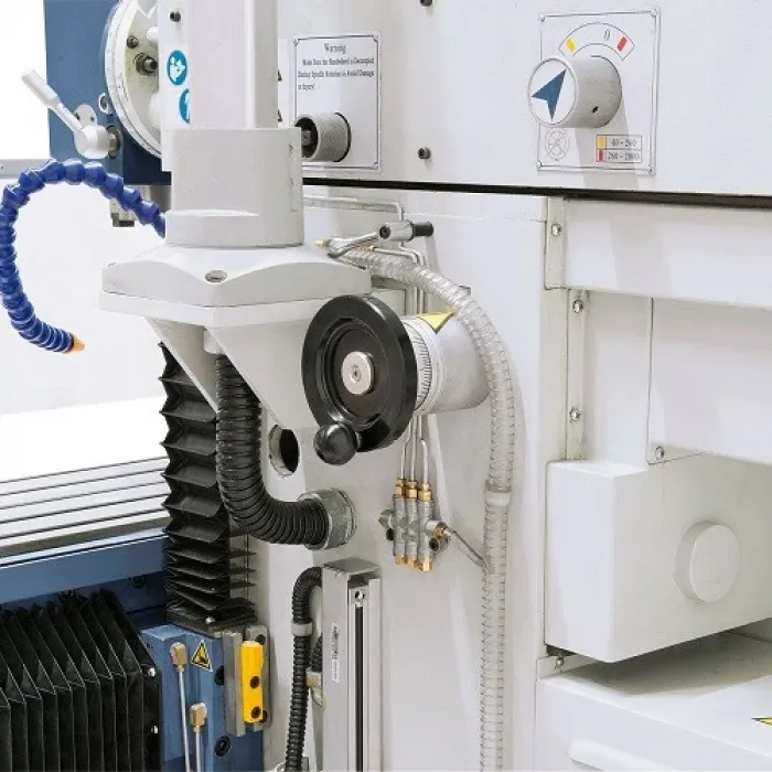 Окомплектовка триосно цифрово отчитане с LCD дисплей ES-12 H, LED работно осветление, охлаждащо устройство, електронни ръкохватки, хоризонтално лагерно гнездо, работна клетка, сачмени винтове на всички оси, захватен болт M 16, централно смазване, стоманен капак, дълъг фрезови дорник ISO 40 / 16, 40 / 22, 40 / 27 и 40 / 32 mm, преходни втулки ISO 40 / MK 3, ISO 40 / MK 2 и ISO 40 / MK 1, крачета, универсален предпазител, инструменти
