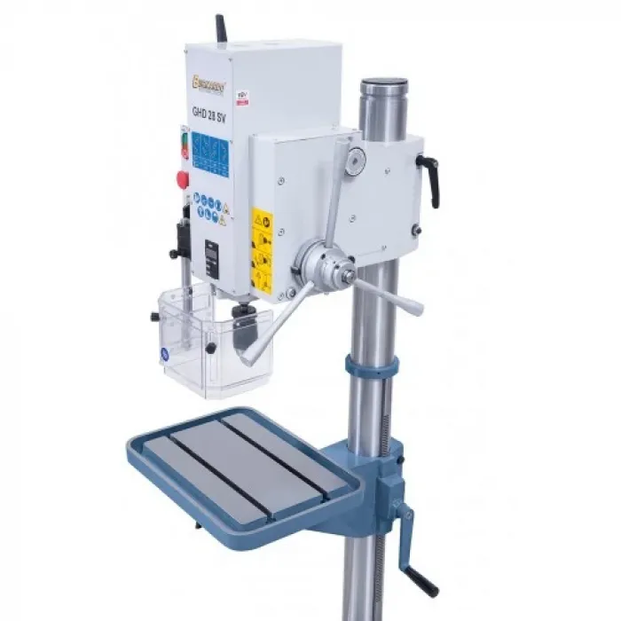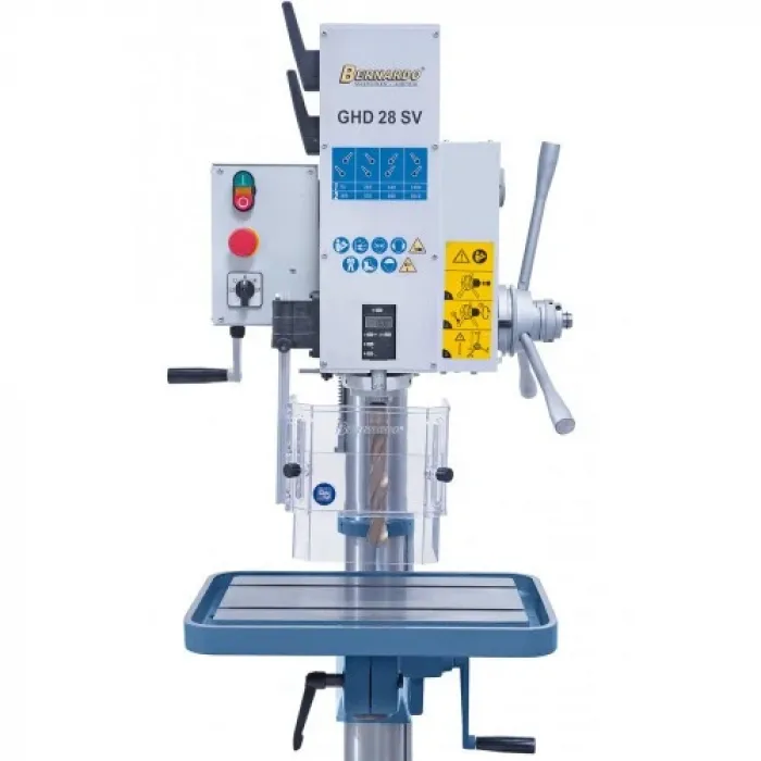 Колонната бормашина BERNARDO GHD 28 SV е стандартно оборудвана с въртене в ляво и дясно, както и с автоматично захранване. Подходяща е предимно за професионална работа, но и за обучение. С дигитален дисплей за дълбочината на пробиване и спирална предавка за оптимално предаване на мощност. Отличава се с висока ефективност и плавно движение благодарение на спирални зъбни колела. При достигане на зададената дълбочина на пробиване автоматичното подаване се деактивира. Бормашината е подходяща за нарязване на резба, а стабилната и заземена стоманена колона дава възможност за работа при високи натоварвания. Качествените сачмени лагери гарантират висока концентрация, а възможноста за 8 сменяеми скорости е осигурена от мощния задвижващ мотор.