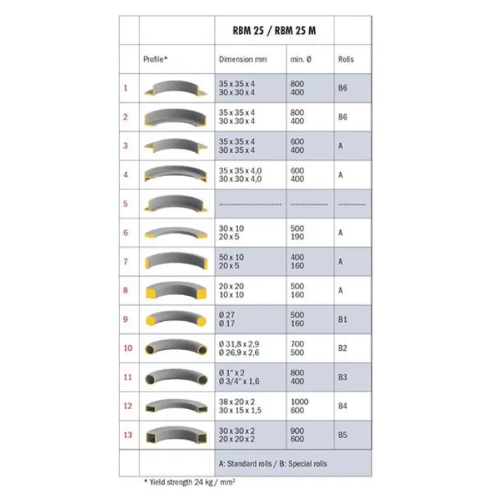 BERNARDO RBM 25 M е машина за огъване на профили и тръби. Работи със закалени валове, с помощта на които се извършва самия процес. Диаметърът на вала е 30 mm. Машината е оборудвана с педал на краката за управление и е изработена със стабилна издръжлива конструкция, както и с възможност за вертикално и хоризонтално работно положение.