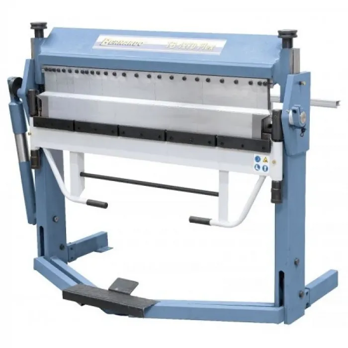 Абкантът BERNARDO TB 1270 Flex ви дава голяма производителност при огъване на метални листи, без необходимост от електрическо или моторно задвижване. Двете греди за закрепвана не сегменти осигуряват възможност за изработка на касетъчни профили и други усложнени сгъвки, което я определя като уред от професионален клас, подходящ за ремонтни и производствени цели. Въпреки всичко принципът на действие си остава прост, което прави експлоатацията и регулацията на абканта лесна. За лесно овладяване на обработения материал, машината има заден ограничител/опора.