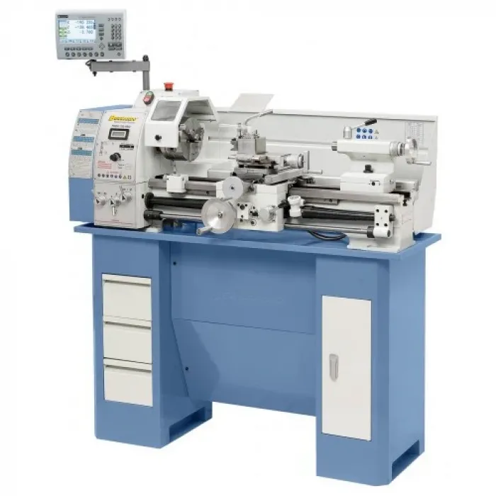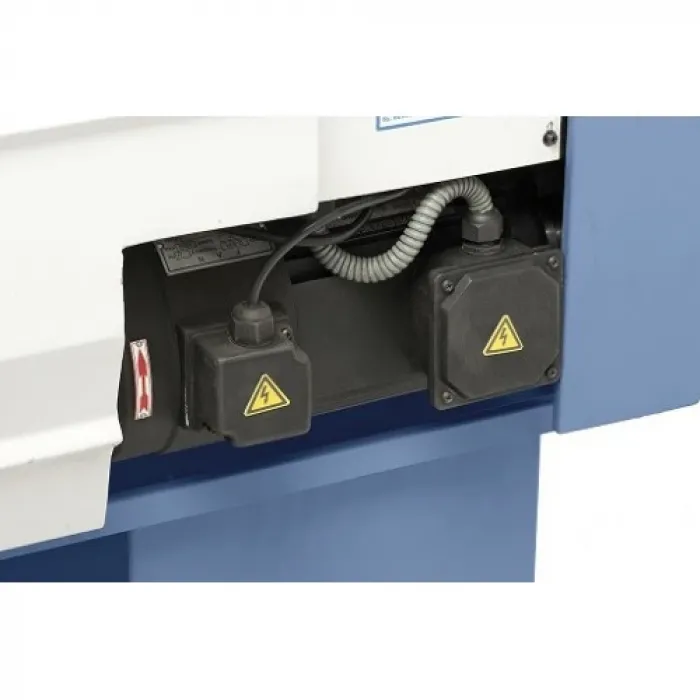 Окомплектовка тричелюстен патронник PO3 - 160 mm, фланец 160 mm, неподвижен център, зъбни колела, държач за инструменти с бърза смяна и 2 вложки, предпазен съединител, микрометричен надлъжен ограничител, кръстат супорт с горно придържане, честотен инвертор, цифрово отчитане на оборотите, циферблат за стъпката на резбата, предпазител на патронника, предпазител на супорта, капак за водещия винт, инструменти