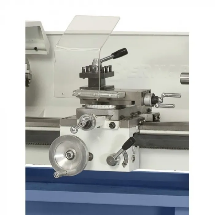 Окомплектовка тричелюстен патронник 100 mm, зъбни колела, неподвижен център, четворен държач за инструменти, кръстат супорт с горно закрепване, предпазител на патронника