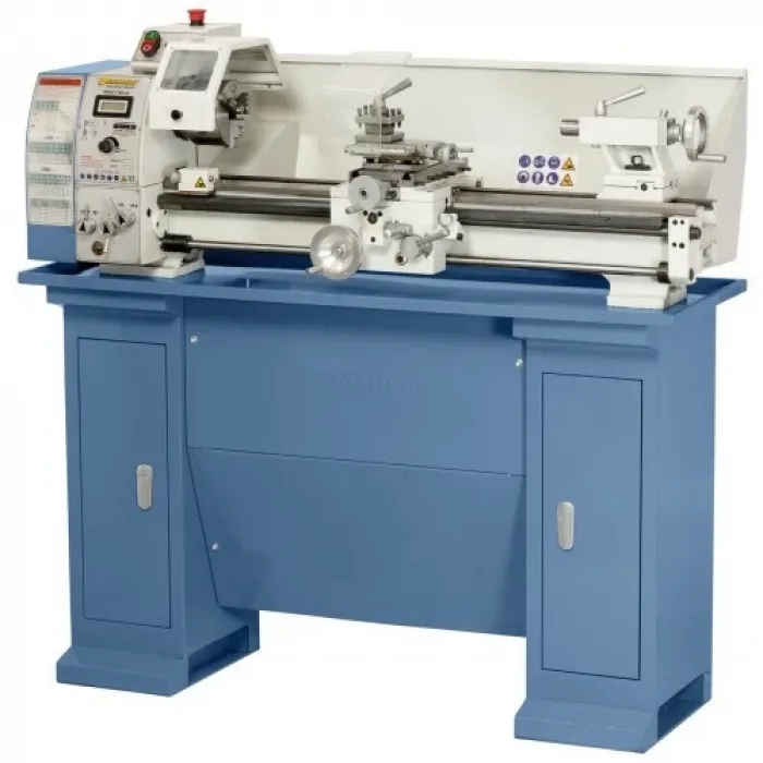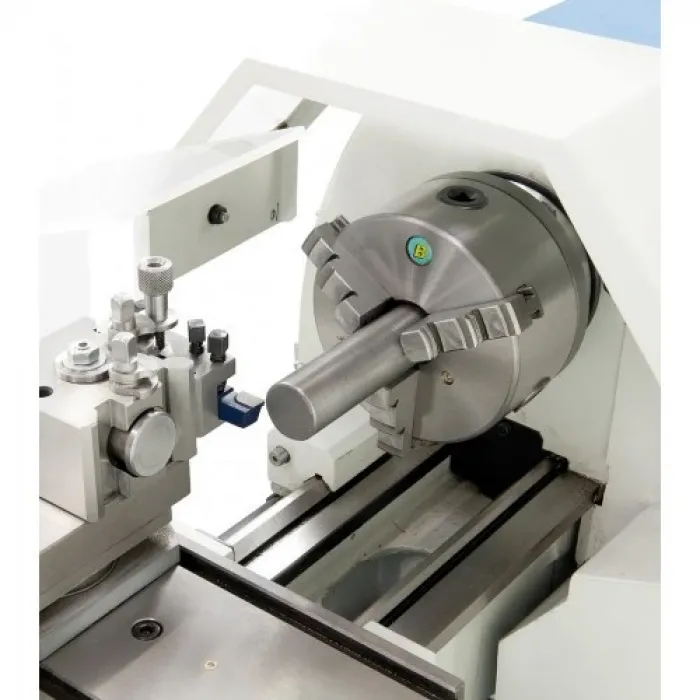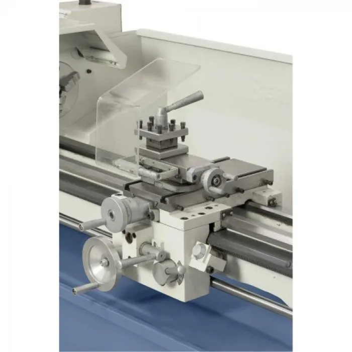 Окомплектовка тричелюстен патронник DK11 - 125 mm, фланец 125 mm, неподвижен център, зъбни колела, четворен държач за инструменти, предпазен съединител, микрометричен надлъжен ограничител, кръстат супорт с горно придържане, цифрово отчитане на скоростта, циферблат за стъпкана на резбата, предпазител на патронника, предпазител на супорта, капак на водещия винт, инструменти