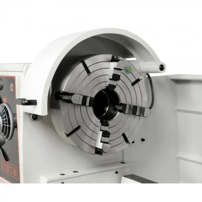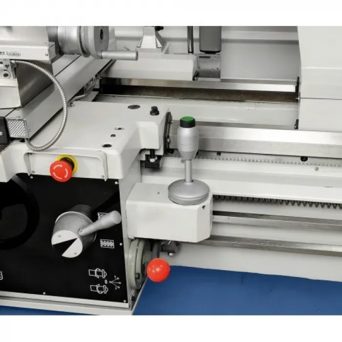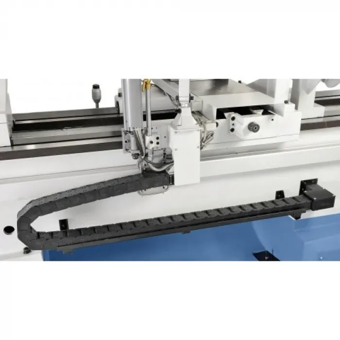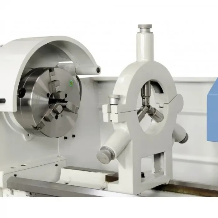 Окомплектовка триосно цифрово отчитане с LCD дисплей ES-12 V, предпазен съединител, бързо надлъжно и напречно подаване, LED работно осветление, тричелюстен патронник PO3 - 315 mm / D8, лицева плоча 500 mm, неподвижен люнет 180 mm, подвижен люнет 100 mm, 2 броя неподвижен център, стоп педал, охлаждащо устройство, държач за инструменти с 4 вложки, предпазител за държача за инструменти, зъбни колела, преходна втулка, кабелен водач, честотен инвертор, инструменти