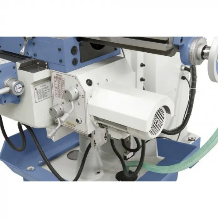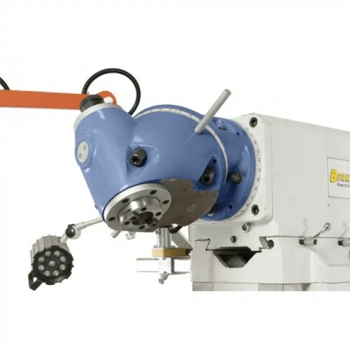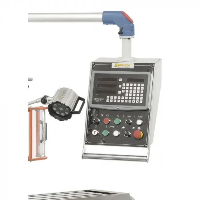 Окомплектовка триосно цифрово отчитане с LCD дисплей ES-12 H, LED работно осветление, охлаждащо устройство, централно смазване, хоризонтално лагерно гнездо, дълъг фрезови дорник 32 mm, подаване по X и Y осите, мотор за изместване по Z-оста, ваничка за охлаждаща течност, регулируем предпазител, инструменти