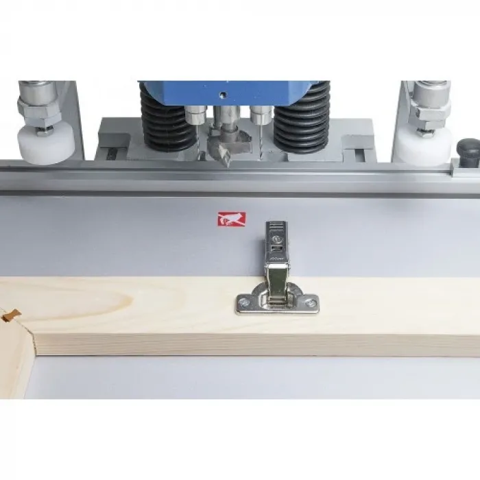 Окомплектовка Свредло за панти 35 mm, два броя маркиращи свредла 2 mm, работен възел с три вретена, линеал 0,5 m с два ограничителя, ръчен лост за подаване, работна маса