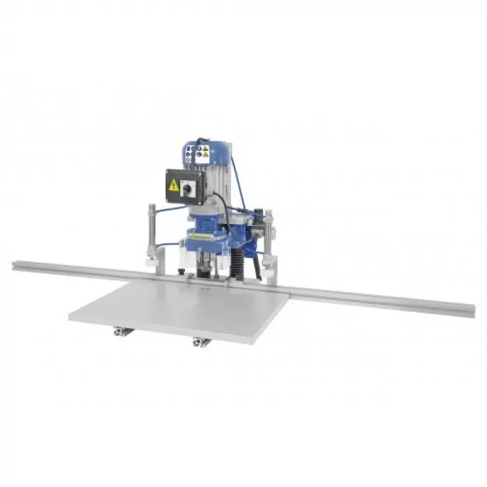 Окомплектовка Свредло за панти 35 mm, два броя маркиращи свредла 2 mm, работен възел с три вретена, линеал 1,5 m с два ограничителя, два броя пневматични притисквачи на детайла, пневматично подаване на работния възел към детайла, пневматичен педал, работна маса