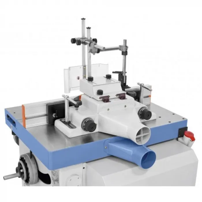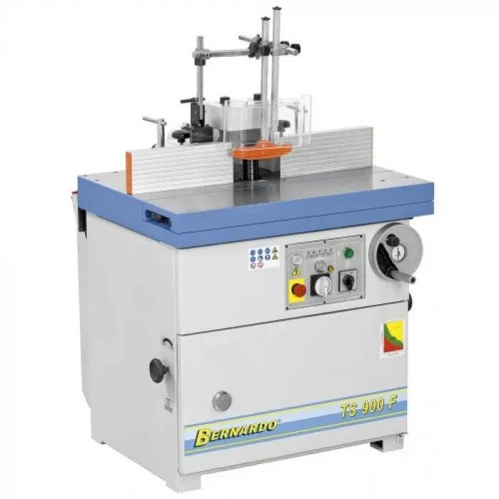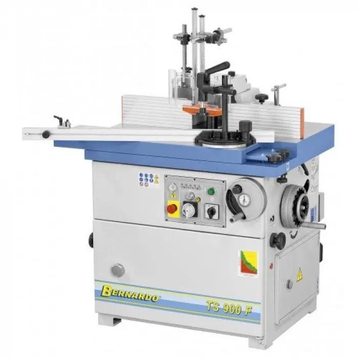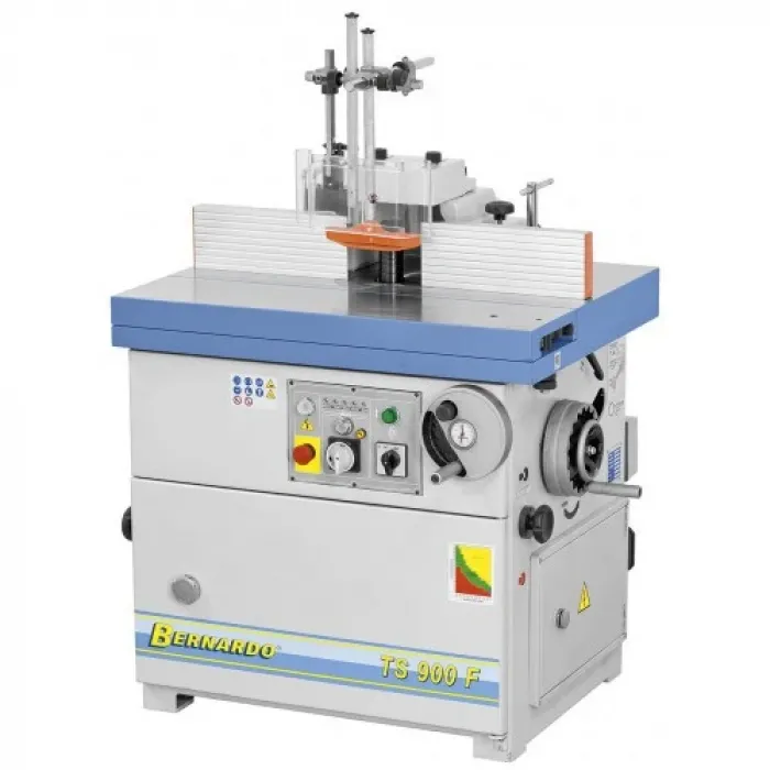 Фрезата за дърво BERNARDO TS 900 F с накланящ се шпиндел е надежден модел, включващ работен плот с интегрирана плъзгаща се маса като част от стандартното оборудване. Големият брой приложения, лесната работа, широката гама от стандартно оборудване и безупречното покритие правят машината идеална за професионални потребители. Предназначена е за обработка на ръбовете на праволинейни елементи и за създаване на декоративни корнизи, жлебове и др. Шпинделът на машината може да се придвижва нагоре и надолу в диапазон от 180 милиметра. Вибрациите са сведени до минимум, благодарение на завареното стоманено тяло и масивната работна маса от чугун.