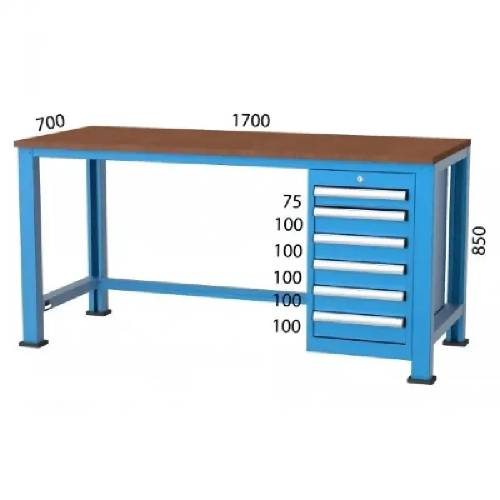 Идеално решение на работна маса за професионална употреба. Работна маса е снабдена с 6 чекмеджета, което я правят много функционална и удобна по време на работа. Товароносимост до 500 кг.