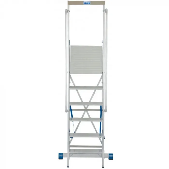 Стоящата алуминиева стълба с платформата KRAUSE STABILO 127761 има здрав стабилизатор с вградени транспортни колела за допълнителна сигурност и улеснено транспортиране. За максималната сигурност при слизане и качване има поставени парапети от двете и страни. Самата алуминиева стълба е много лесна за преместване, когато е в отворено състояние, а в затворено състояние заема малко място при съхранение. Благодарение на вграденото защитно устройство на опън и натиск стълбата е максимално обезопасена.