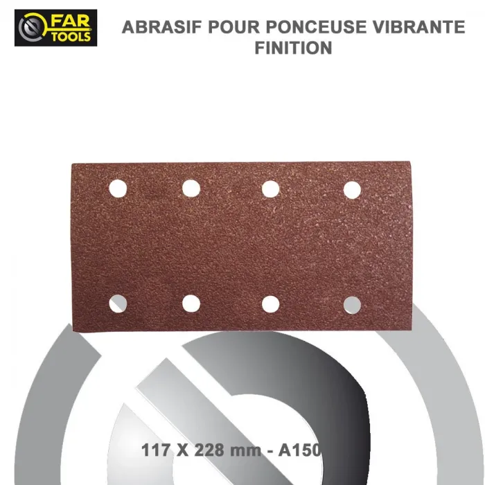 Шкурка за виброшлайф правоъгълна FARTOOLS 228 x 117 mm , P150 е изключително здрава и устойчива, като е най-добре приложима за дървени материали и плоскости. Лентите от този модел са подходящи за почти всички шлифоващи инструменти, без значение от тяхната марка или вид. Размерът на шкурката е 228мм х 117 мм, а големината на зърното е P150. Отворите на повърхността на шкурката, които имат особено голямо значение за нейната производителност, са 8.