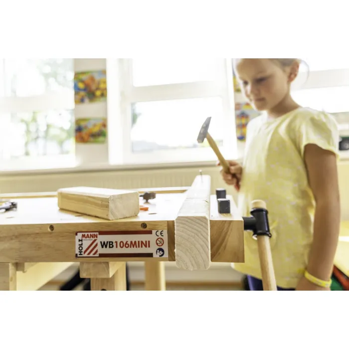 Работна маса за деца Holzmann WB106MINI е с общи размери 1060x610x700 мм и товароносимост до 150 кг. Тя е с много място за съхранение, като работната дължина може да бъде адаптирана чрез допълнителни крачета, така че работната маса да бъде идеалното работно място за децата в продължение на години. Масата е сертифицирана съгласно EN71-1 и не е подходяща за деца под 3-годишна възраст. Допълнителен акцент са и стикерите от BADALA, които са специално създадени за Holzmann.