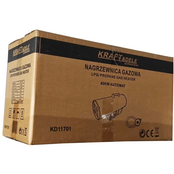 Газов калорифер с мощност 40 kW, работещ на пропан-бутан (LPG), е оборудван с вграден термостат с контрол на температурата и цифров дисплей, което ви позволява лесно да настроите желаната температура на околната среда. Нагревателят работи автоматично, в зависимост от зададената температура.