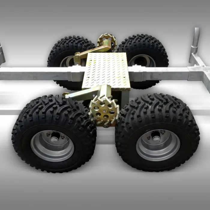 Ремаркето може да бъде преместено лесно с помощта на теглича. Много от нашите клиенти теглят ремаркето с ATV (или четириядрен или малък трактор), тъй като вие също сте много гъвкави по тесни пътеки. Ремаркето не е разрешено за транспорт по обществени пътища.