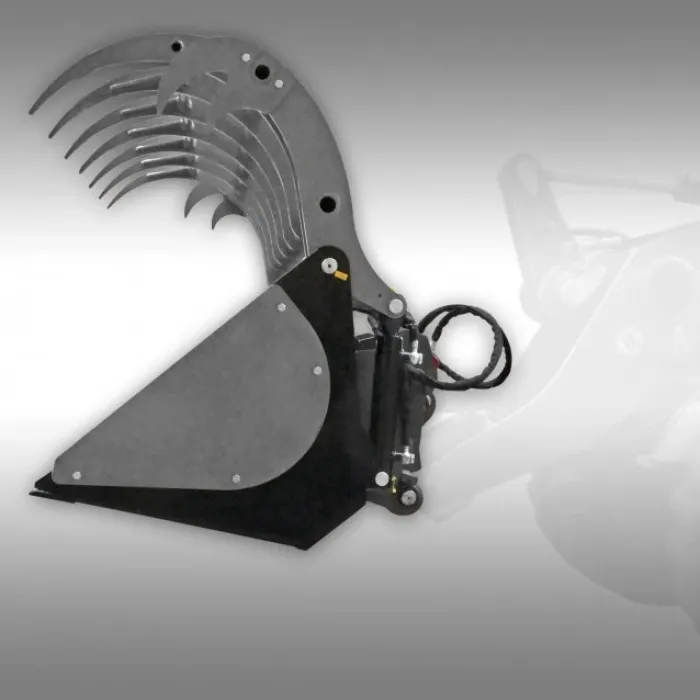 Ширината на отваряне на кофата е приблизително. 90 см. Сърповидната конструкция на горния нокът на кофата предотвратява пробиването на материалите. Чрез отделянето на двете странични приставки, можете да използвате тази грайферна кофа за транспортиране и събиране на трупи, например или други, по-дълги материали.