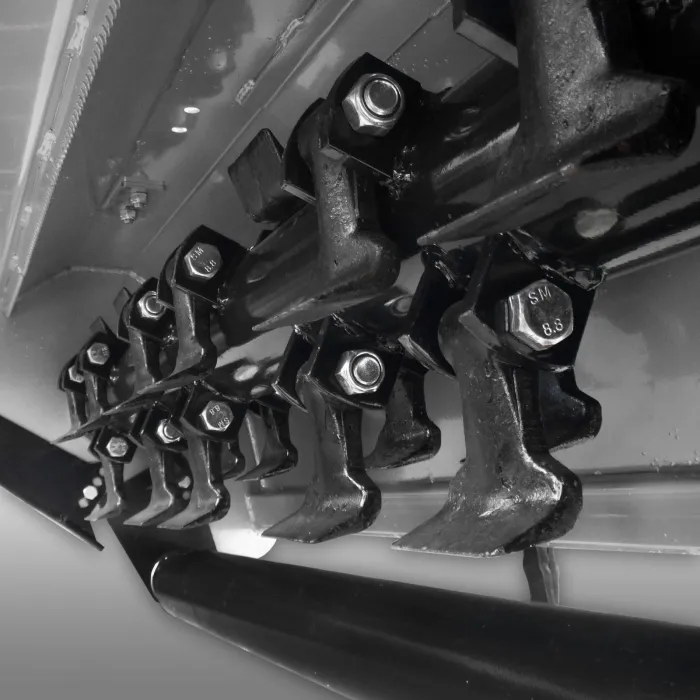 Тази косачка има най-тежката скоростна кутия в своя клас. За разлика от косачните агрегати, оборудвани с леки Y ножове, тази косачка има висока инерция, генерирана от тежките чукови ножове и тежката ос. Това позволява на нашата машина да работи по-добре.