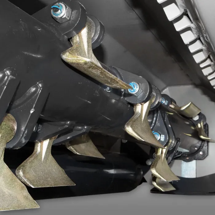 16-те специално закалени, 1,2 кг остриета за чук, които са разположени върху двойно спирален задвижващ вал, раздробяват изрезките до минимален размер. Дори много високи тревни, храсталаци или подобни на слама изрезки не са проблем за тази косачка!