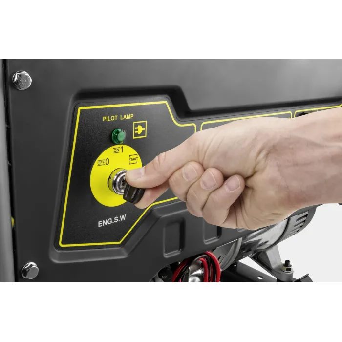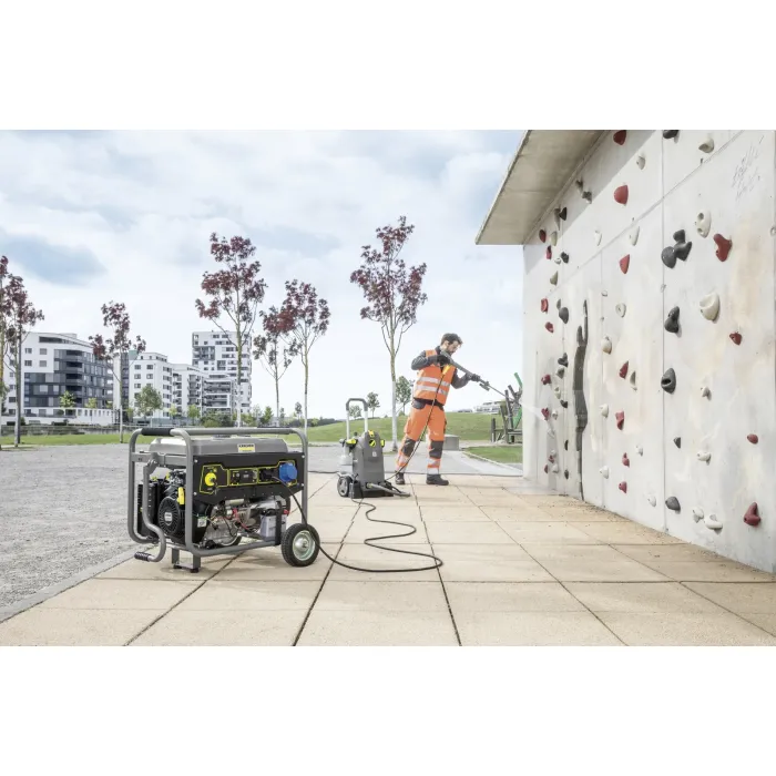 Дали за търговски или общински приложения: често няма източник на енергия. Този проблем се решава бързо с мощния синхронен генератор PGG 8/3 на Karcher. Благодарение на устойчивите на пробиване колела и сгъваемата дръжка, той е лесен за транспортиране и маневриране на място. 25-литровият резервоар осигурява дълги работни интервали до 7 часа (при пълна мощност до 5,5 часа), надеждният 4-тактов бензинов двигател (EU STAGE V) осигурява постоянна мощност от 7 kW. С 2 заземени гнезда (AC) и червен цокъл 400 V (трифазен ток), той предлага достатъчно възможности за свързване на Вашето оборудване. Автоматичният регулатор на напрежението (AVR) дава възможност за работа на чувствителни електронни устройства. Притежава полезни детайли на оборудването, като защита от претоварване и недостиг на масло, както и здрава тръбна стоманена рамка. Всичко това надеждно защитава потребителите и машината от всякакви рискове или щети.