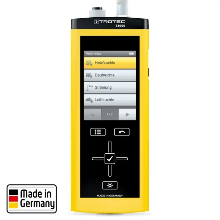 T3000 има специална опция от менюто за измерване на влагата на дървесни материали със селекция от стотици различни дървесни видове. Техните доказани свойства на материала се съхраняват директно в T3000 и могат да бъдат изтеглени при необходимост. За температурни компенсации, като студено дърво или измервания по време на процесите на сушене на дървесина, можете да въведете предварително определена стойност като фиксирана стойност или да използвате вътрешния температурен сензор на измервателното устройство. Влиянието на определена температура върху съдържанието на влага в дървесината автоматично се взема предвид при изчисляване на съдържанието на влага.