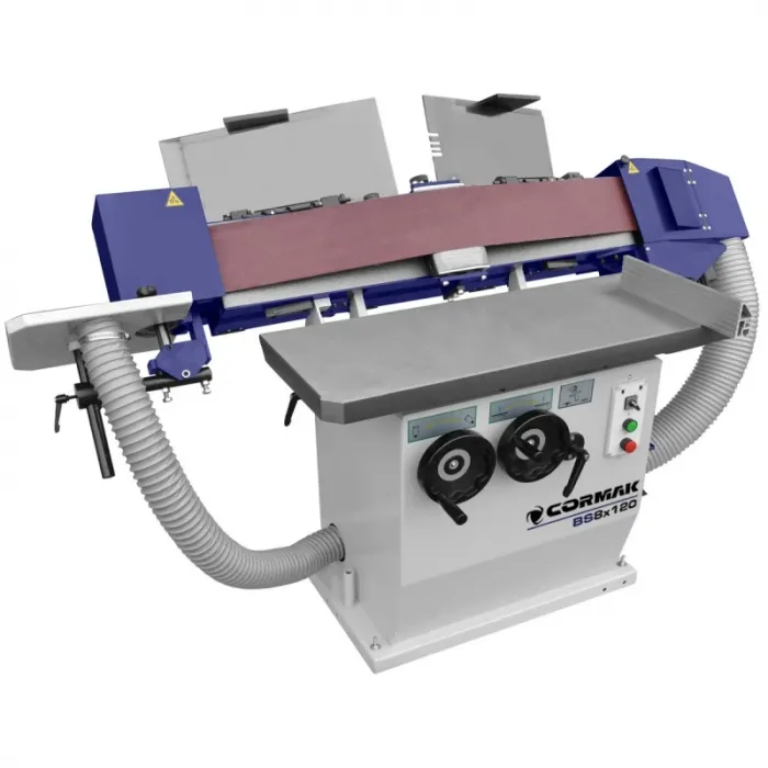 Професионалната шлифовъчна машина BS8x120 е устройство, предназначено за промишлени производствени предприятия и малки дърводелски работилници. Машината има голяма чугунена маса с идеално полирана шлифована повърхност. Плавно регулиране на височината на масата за използване на цялата шлифовъчна лента и прецизна обработка на материала. Производителността на мелницата и качеството на изработка гарантират дълга, стабилна и безпроблемна работа. Регулиращата система за смилане позволява перфектна работа в диапазона от 90-45 градуса. Допълнителна странична маса от чугун с отвор за извличане и регулиране на височината за извито шлайфане. Висококачествено осцилиране с отделен мотор за по-прецизна работа и по-дълъг експлоатационен живот на шлифовъчната лента