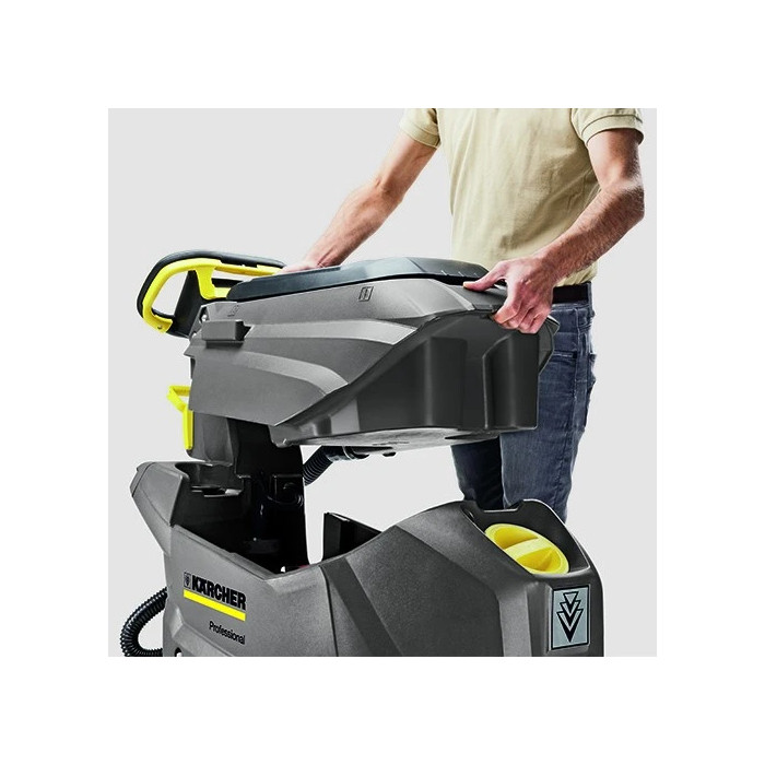 Смяната на четката за работа се осъществява лесно, без употребата на допълнителни инструменти. Смукателят се повдига чрез специална ръчка за тази цел. Новата система с два резервоара (резервоар в резервоар) осигурява по-голяма продължителност на работа без прекъсване. 50-литровият резервоар за чиста и мръсна вода минимизира времето, необходимо за презареждане. Класически дизайн за лесна експлоатация и поддръжка. Лесно достъпни компоненти.