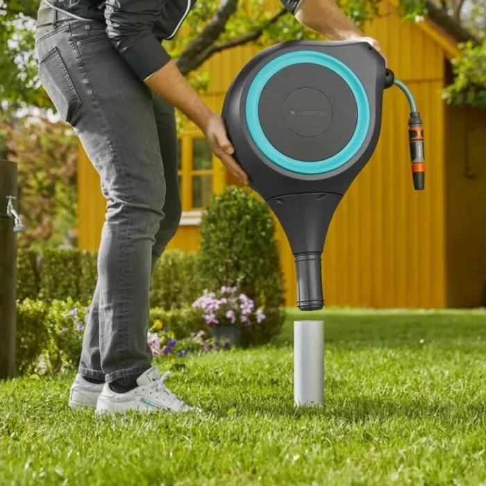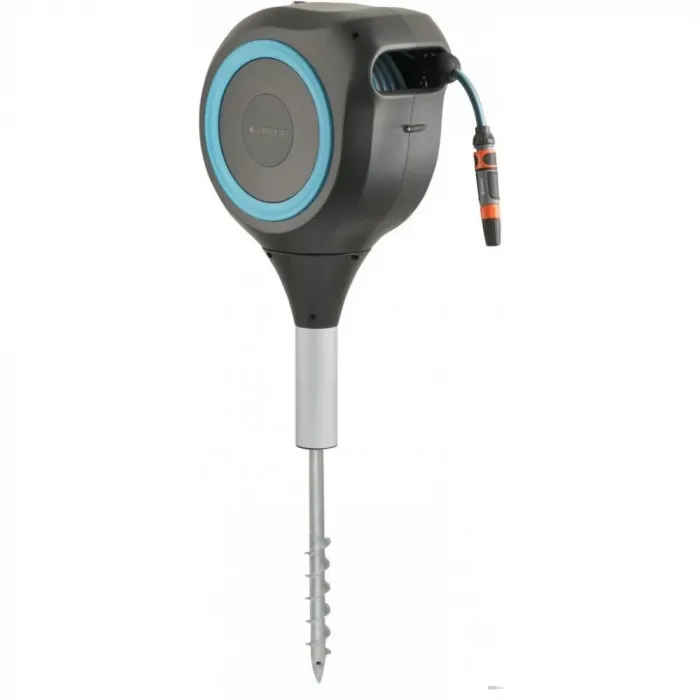 Градинска макара с маркуч RollUp М със син декоративен елемент, въртяща се на 360°, поставена върху здрав метален кол, който се навива в земята чрез монтажен прът. Вградените на кратки интервали точки на заключване осигуряват лесно манипулиране и автоматично фиксират маркуча на желаната дължина на изтегляне до максималните 20 м. Кратко дръпване на развития маркуч задейства вградената пружина, която го навива обратно автоматично. Кутията е регулирана спрямо височината на роботизираните косачки Gardena.