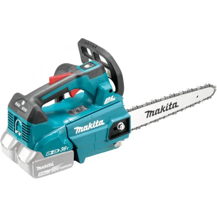 Акумулаторният верижен трион е с високоефективен безчетков двигател, захранван от 2 x 18v литиеви батерии последователно, доставящи енергия към 36v DC моторна задвижваща система. Металната броня с шипове здраво захваща детайла, осигурявайки повече контрол и улеснявайки рязането, плюс превключвателят на захранването използва функция за автоматично изключване, като автоматично изключва захранването, когато спусъкът на превключвателя не е натиснат за определен период от време. Задържащите се гайки предотвратяват загубата на гайка при сваляне на капака на зъбното колело, за да смените направляващата шина или веригата на триона. Други характеристики на верижния трион включват контрол на променлива скорост, електрическа спирачка на веригата, спирачка за откат, регулиране на веригата, усилване на въртящия момент за по-трудни рязания и индикация на капацитета на маслото.