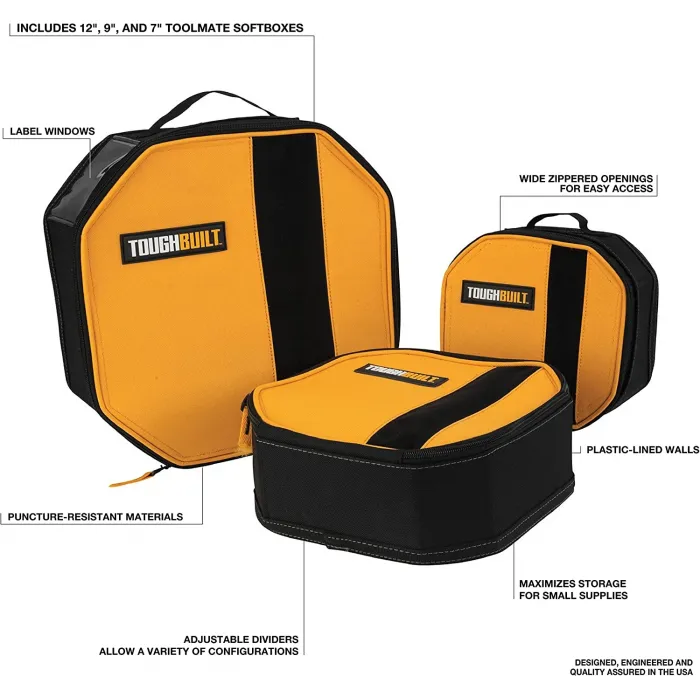Комплекта чанти опростява съхранението на малки консумативи. Три различни размера осигуряват гъвкавост. Най-големият 30 см SoftBox включва регулируеми разделители, които пасват на всичко - от крепежни елементи до електроинструменти. Отличаващи се с мрежести прозорци за тежък режим и широки отвори с цип, тези SoftBoxове осигуряват превъзходна видимост и достъпност. Прозорците с етикети правят организацията лесна работа. Изработени от здрава, структурирана отстрани, тези софтбоксове издържат на най-строгите работни среди.