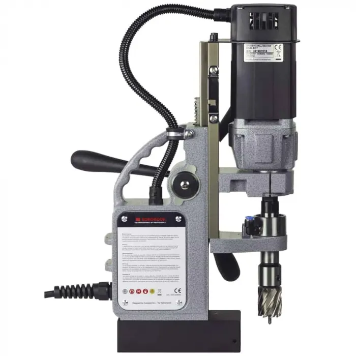 Компактната магнитна бормашина Euroboor ECO.32-T е подходяща както за пробиване, така и за нарязване на резби и има мощен едноскоростен 1000 W мотор. Тази преносима магнитна машина за ядково пробиване е подходяща за използване със спирални свредла Weldon до ø 13 mm и зенкери до 40 mm. Тази лека и надеждна машина е истинско допълнение към всяко работно място. Силен двупосочен магнит с двойна намотка, обработен с CNC , което кара машината да използва по-малко енергия, генерира по-малко топлина и следователно издържа по-дълго