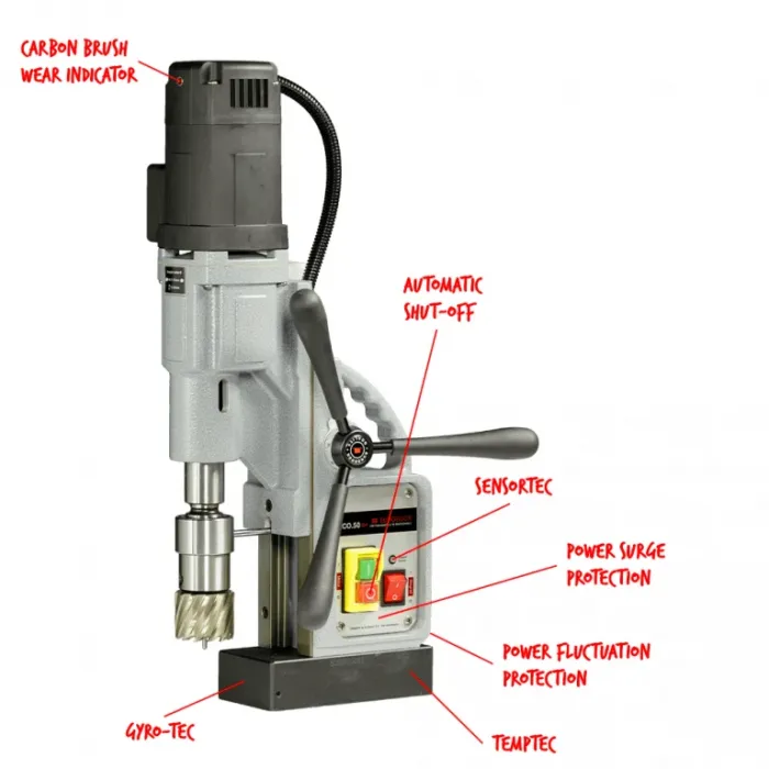 Магнитната бормашина Euroboor ECO.50S+ преобразува максимална мощност чрез своята двускоростна смазана с масло скоростна кутия. Това подобрява ефективността на двигателя и живота на ключовите компоненти. Тази преносима промишлена магнитна бормашина има иновативна електроника, която предлага повече безопасност, значително намалява риска от повреда на машината, инструмента и детайла и предпазва потребителя в случай на прекомерни вибрации или внезапно изместване. Животът е значително по-дълъг и избягвате високи разходи за поддръжка.