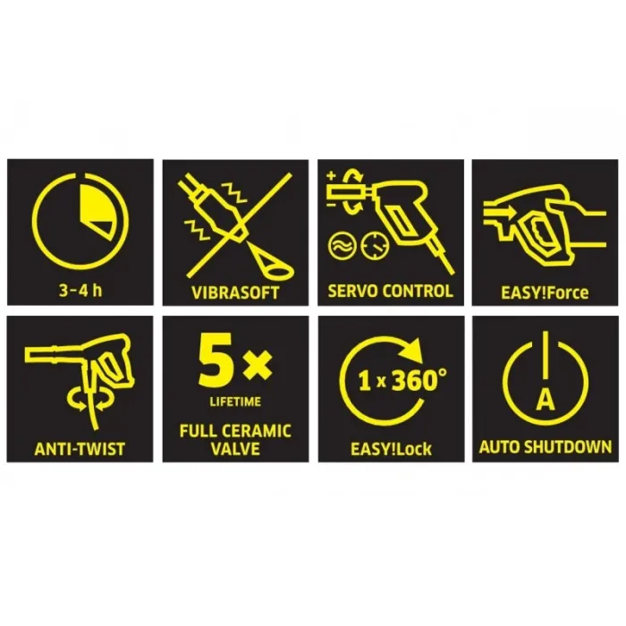 Водоструйката е предвидена за ежедневна употреба при тежки условия. Устойчивата на почистващи препарати месингова цилиндрова глава и керамични буталата гарантират дълъг експлоатационен живот. Водоструйката с трифазно електрозахранване убеждава с комфорта на употреба и мощност от 210 бара при дебит от максимум 1000 l/h. Благодарение на изправената си форма HD 10/21-4 S се нуждае от малко място в сравнение с конвенционалните уреди и е по-лесна за маневриране особенно около препядствия. За това допринасят и големите гумени колела, с които уредът лесно се транспортира дори и по неравни повърхности. Аксесоарите, които не се използват, могат да се съхраняват в отделното отделение за дюзи, така че да не се изгубят. Новите иновации гарантират безпроблемна експлоатация и спестяване на време за настройка и демонтаж. Пистолетът за високо налягане EASY! Force използва силата на отката на струята с високо налягане, за да намали задържащата сила до нула. EASY!Lock връзките правят работа пет пъти по-бърза, отколкото при конвенционалните винтови връзки, без да губите здравина или дълголетие.