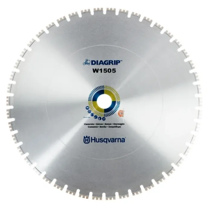 Диамантените дискове от серията W1500 се предлагат с революционната технология Diagrip, където диамантите са специално обработени, за да се разпределят оптимално и да останат на мястото си по-дълго време. Предлага се и нискошумова версия с трислойна сандвич сърцевина, която произвежда 50% по-малко шум от стандартното твърдо ядро. Диамантени дискове произведени от Husqvarna, Diagrip W1505. Със своята модерна конструкция, дисковете за рязане на стени на Husqvarna винаги осигуряват най-висока производителност, имат дълъг експлоатационен живот и неоспорими свойства на рязане.
