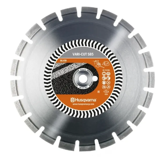 Диамантения диск се използва за работа с фугорез. Може да се използва и за абразиви. Диаметър 450х25.4 мм, височина на сегмента 10 мм, стандарт за безопасност EN13236. За работа с фугорез. Диамантен диск Husqvarna, Vari-Cut S85 от серия Silver за мокро рязане на асфалт.