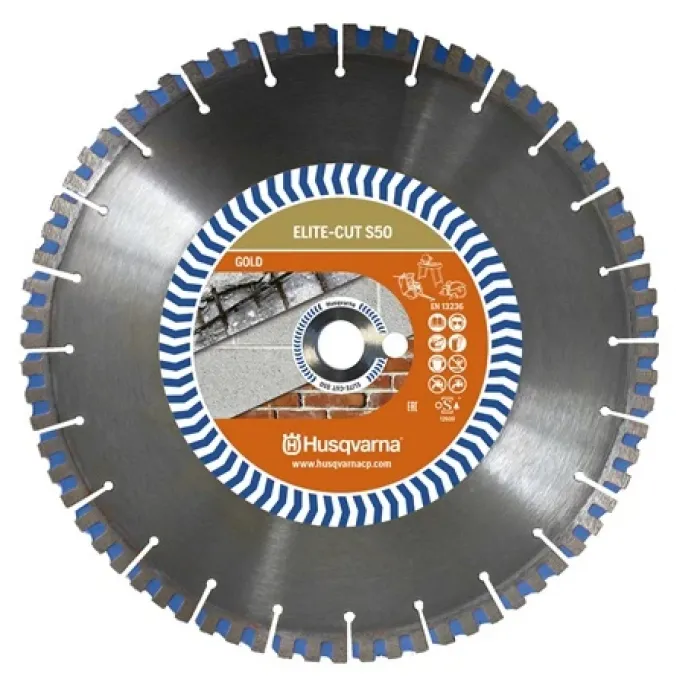 Диамантения диск е подходящ за мокро рязане на бетон и тухли. Може да се използва и за гранит, мрамор, абразиви и керамични плочки. Диаметър 300х25.4 мм, височина на сегмента 12 мм, стандарт EN13236. За работа с настолна отрезна машина. Диамантен диск Husqvarna, Elite-Cut GS50 от серия Gold, разработена за интензивна професионална употреба. Предлага максимална скорост на рязане и устойчивост на износване при тежко рязане.