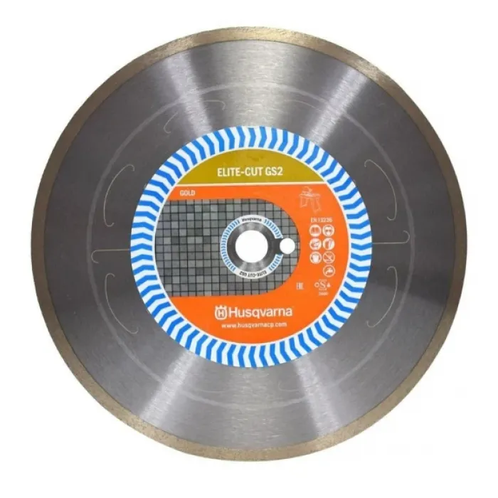 Диамантения диск е предназначен за интензивна професионална употреба, с максимална скорост на рязане и устойчивост на износване при тежко рязане. Диаметър 350х25.4 мм, височина на сегмента 10 мм, стандарт EN13236. За работа с настолна отрезна машина. Диамантен диск Husqvarna Elite-Cut GS2 от серия Gold, за мокро рязане на керамични плочки, мрамор и гранит.