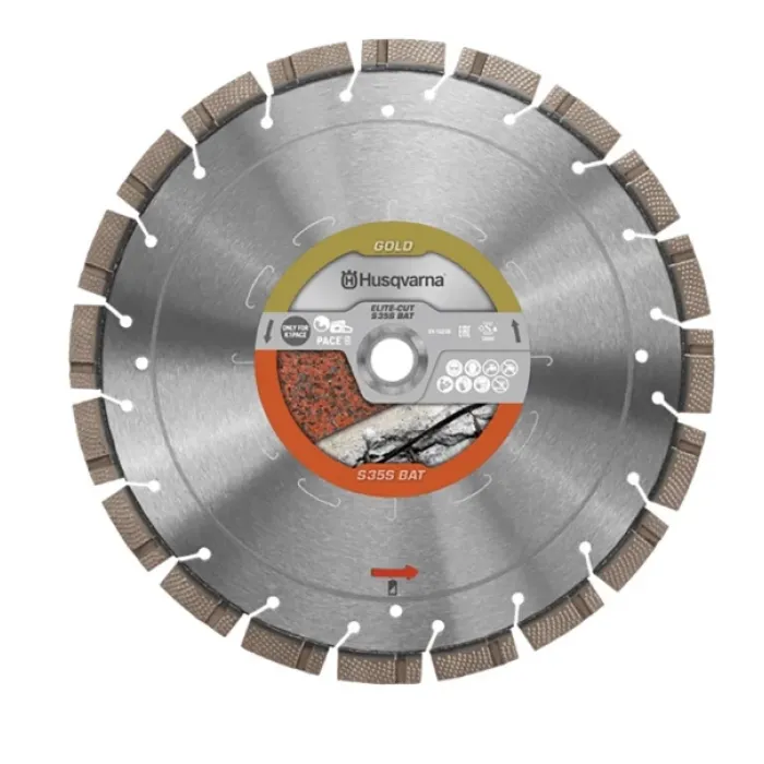 Диамантения диск може да се използва и за керамични плочки и керемиди. Диаметър 350х25.4 мм, височина на сегмента 15 мм. За работа с бензинов ъглошлайф K 1 Pace. Диамантен диск Husqvarna Elite-Cut S35S Battery от серията Gold, предназначен за сухо и мокро рязане на твърд бетон, гранит, мрамор и естествен камък.