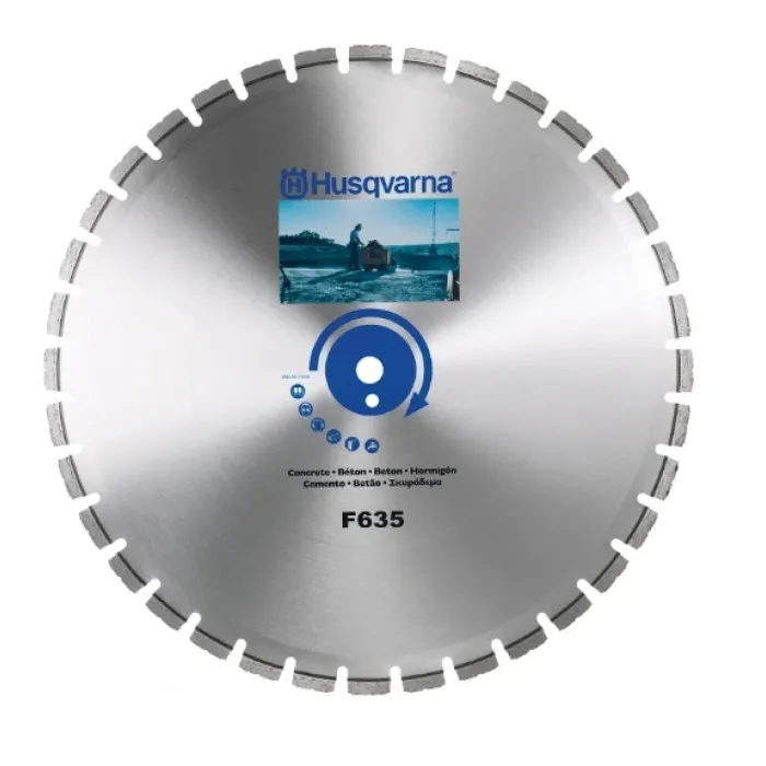 Диамантения диск е изработен е по революционната технология Diagrip, при която диамантите са специално обработени, за да се разпределят оптимално и да останат на мястото си по-дълго време. Наличието на широки канали между сегментите за подаване на вода увеличава експлоатационния живот на дисковете. Специалната форма на сегментите осигурява лесно и гладко врязване в обработваната повърхност. Диамантеният диск ELITE-CUT F635 на Husqvarna е предназначен мокро рязане на армиран бетон и скални материали, добър е и за рязане на тухли.