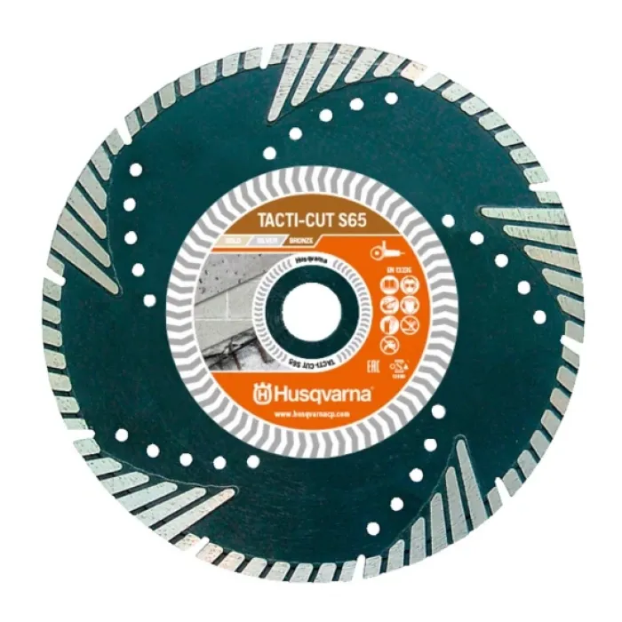 Диамантения диск е подходящ за работа с фугорез. Диаметър 300х25.4 мм, височина на сегмента 10 мм, стандарт EN13236. Диамантен диск Husqvarna Tacti-Cut S65 от серия Bronze за сухо и мокро рязане на бетон, армиран бетон, тухли, керемиди и абразиви. Може да се използва и за асфалт.