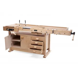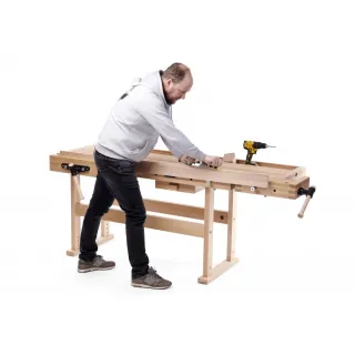 Работната маса е предназначена за по-големи цехове. Снабдена е с две менгемета с централен винт и две водещи релси за прецизно и здраво водене - предното менгеме е масивно с дължина 520 мм и ширина 70 мм. Задното менгеме е с дължина 450 мм и ширина 140 мм. На задното менгеме има 3 отвора. Останалите 16 отвора за зенкерите могат да бъдат намерени на плота на масата. Предното менгеме включва 2 отвора. Предната, висока 110 мм, съдържа 4 отвора за скоби, които можете да използвате за вертикално закрепване на материала при използване на задното менгеме, където има 2 отвора. Поцинкованата конструкция гарантира максимална здравина и дълъг експлоатационен живот. Това е една от най-използваните конструкции за дърводелски маси. Масата включва чекмедже за съхранение на инструменти, които винаги искате да имате под ръка. По дължината на гърба на масата има корито, които можете да използвате, за да приберете неизползваните инструменти, материали или за бързо почистване на работната повърхност.