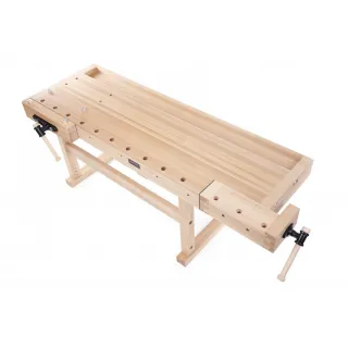 Работната маса е предназначена за професионалисти и предназначен за по-големи работилници. Този модел отговаря на изискванията и на най-взискателните потребители. Конструкцията тип лястовича опашка е възможно най-здравата връзка, която гарантира максимална издръжливост и дълъг живот на масата. Предното менгеме е масивно с дължина 520 мм и ширина 70 мм. Задното менгеме е оборудвано със специален шпиндел, който се използва в най-висококачествените маси на пазара. Този тип шпиндел гарантира абсолютно прецизно и здраво водене на менгемето. Задното менгеме е с дължина 460 мм и ширина 140 мм. На задното менгеме има 3 отвора за крик - останалите 16 отвора са на плота на масата. Предната, висока 110 мм, съдържа 4 отвора за скоби, които можете да използвате за вертикално закрепване на материала при използване на задното менгеме, където има 2 отвора. Масата включва чекмедже за съхранение на инструменти, които винаги искате да имате под ръка.