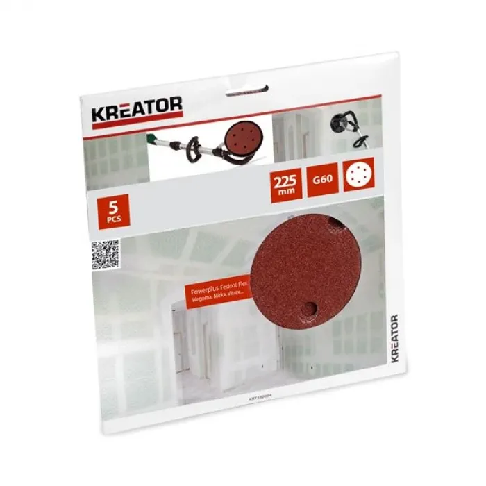 Този комплект шкурки Kreator се състои от 5 броя и е съвместим с повечето машини за шлайфане на гипсокартон, които използват система с кука и примка. Те са с диаметър 225 мм и едрина 60, което ги прави идеални за грубо шлайфане. Това са висококачествени шкурки, които гарантират ефективно и прецизно шлайфане и имат отличен експлоатационен живот.