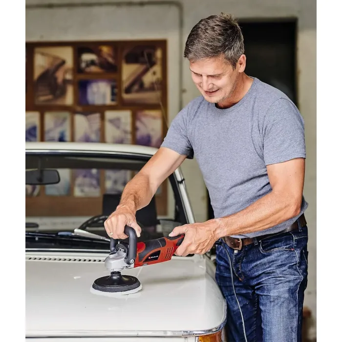 Машината за полиране може да се ползва както за полиране, така и за шлайфане. Системата за заключване на шпиндела гарантира лесно закрепване на полиращия диск, а електронната настройка на скоростта чрез LCD дисплей осигурява контрол. Електрическата полирмашина има мощност 1100 W и диаметър на полиращата подложка 150 мм. Окомплектовката включва полиращи приставки и шкурки с различна зърненост за различните приложения.
