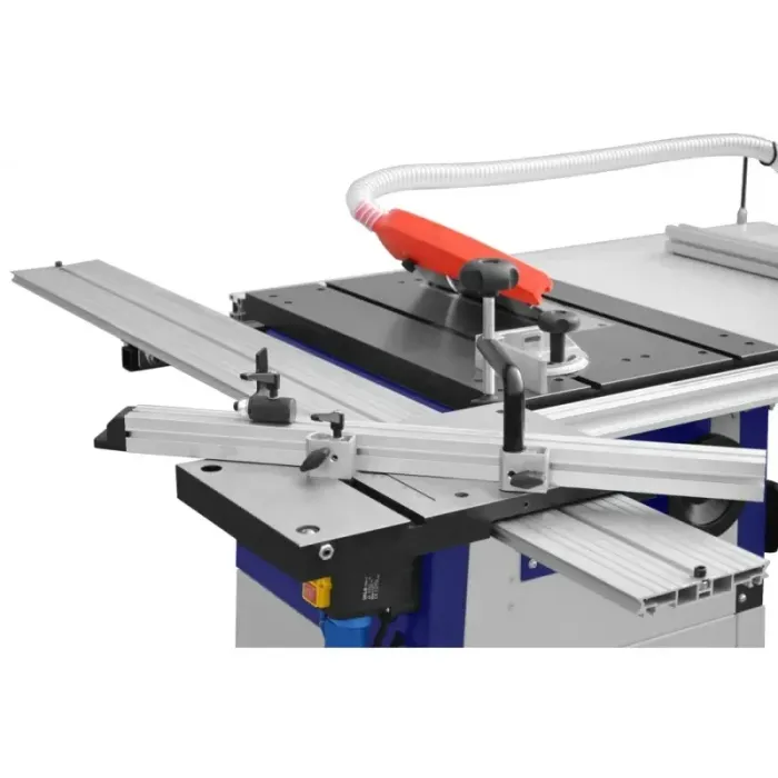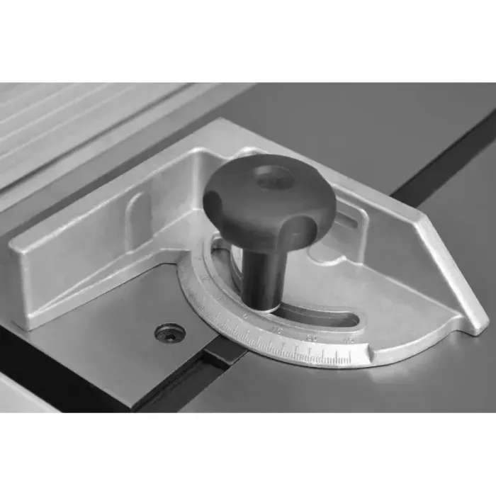 Машината се доставя с удължение на масата по цялата ширина за поддържане на големи детайли. Освен това този циркуляр е оборудван стандартно с ограничител на ъгъла за рязане под ъгъл до 45°